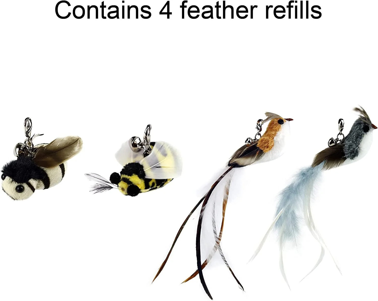 Equipped with a simple clasp mechanism, the refills can be quickly opened and closed for easy replacement. This design allows rotation between different feather styles to maintain curiosity and keep play sessions fresh and engaging.